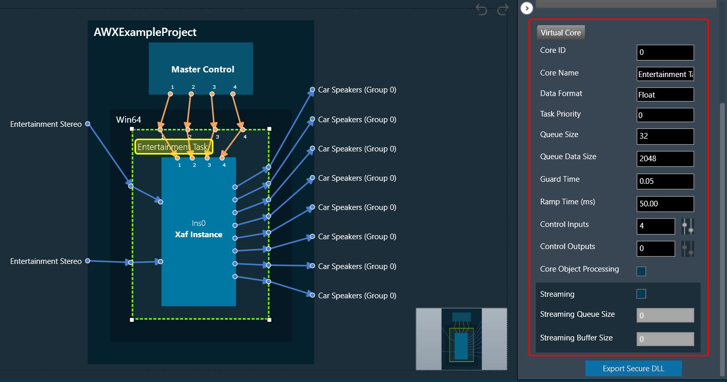 The defined control pin(s) can be routed to one or many virtual cores, as shown below. A direct connection to a Core Object is not allowed, because the received control messages are queued and processed by the AudioCore class. The dequeue process will take care of calling the correct core object(s) and broadcasting (if multiple connections are used for a pin).