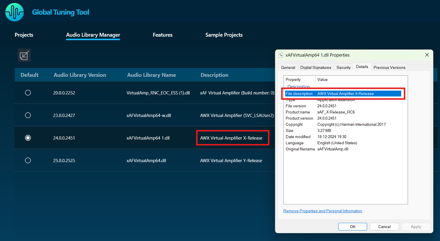 The GTT interacts with the audio library service, which is a Windows service. This service hosts the C++ dynamic linked library xAFVirtualAmp.dll. This DLL exposes several methods that GTT calls from the managed environment, to determine what audio algorithms and memory layouts are available in the DLL.