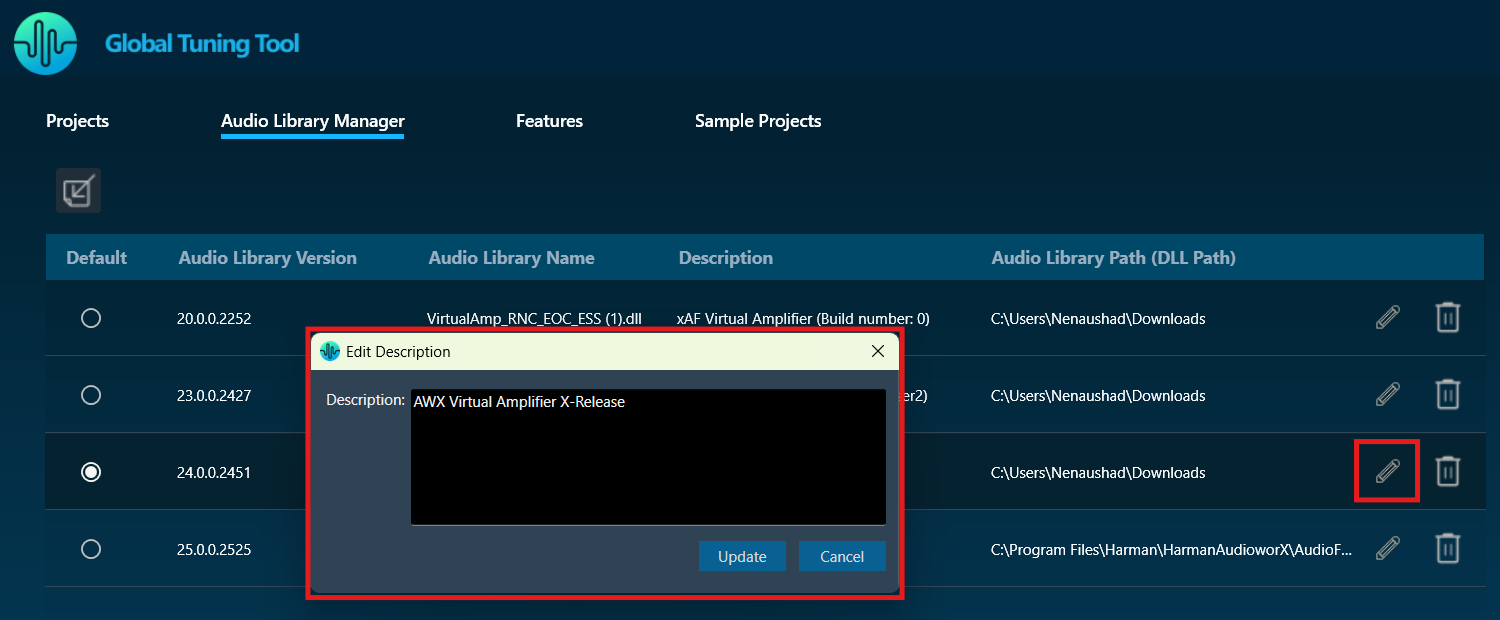 You can modify the description of the audio library DLL by clicking on the Edit Description option. After changing the description, click on Update to save the changes.