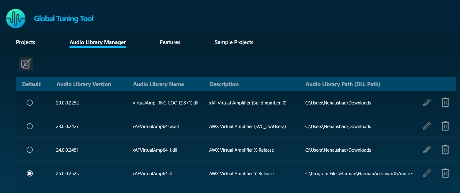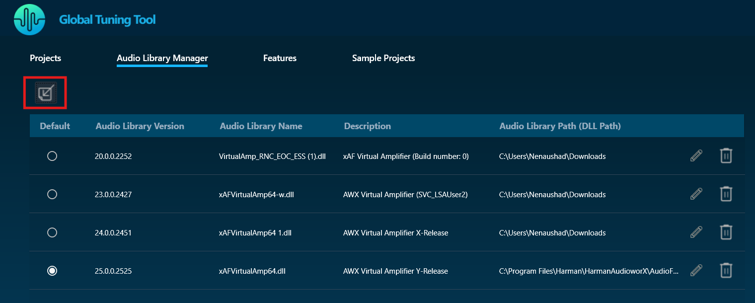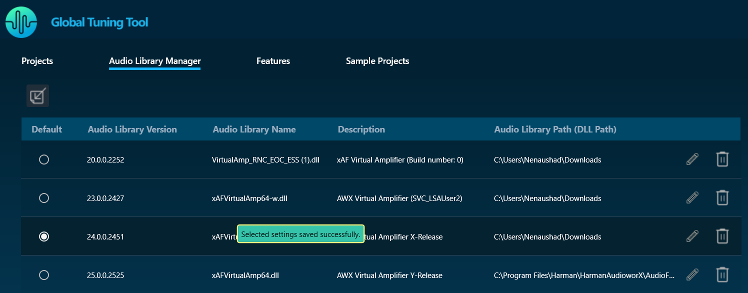 Installed audio library will be set to default when first time launch of the GTT application. You can change the default audio library by selecting the radio button in the Default column and the same will be updated and notified to the user.