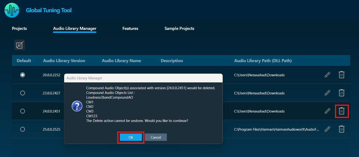 Audio libraries can be deleted only when associated devices and compound audio objects are deleted.