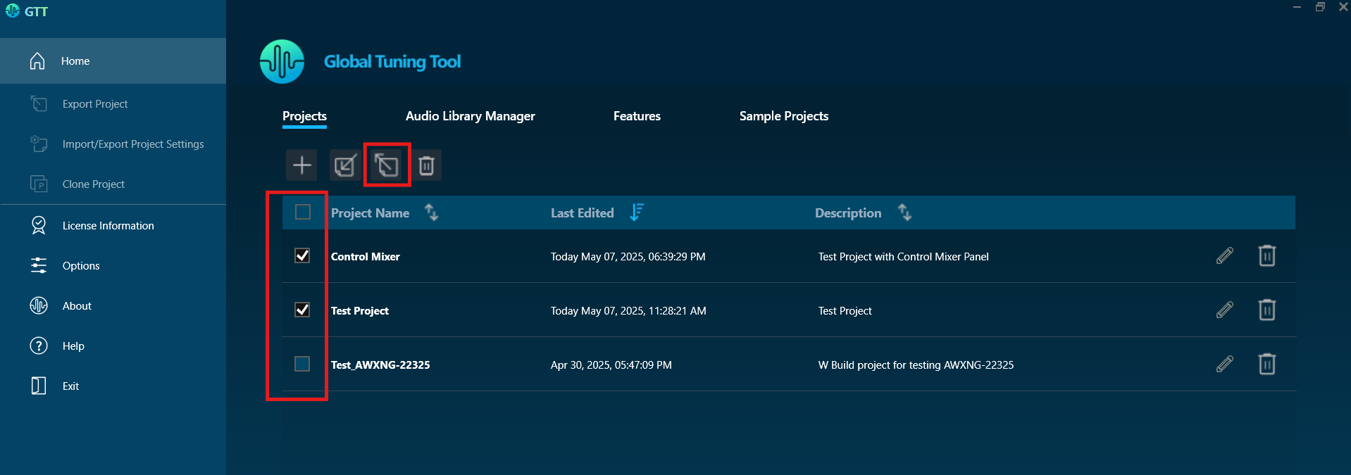 Also, on the left side of the GTT home screen, you will find a File Menu which provides various sub menus like export project, import/export project settings, clone project, display license information and renew license, configure GTT settings, display GTT Tool information and an option to open GTT documentation site; refer Homescreen options.