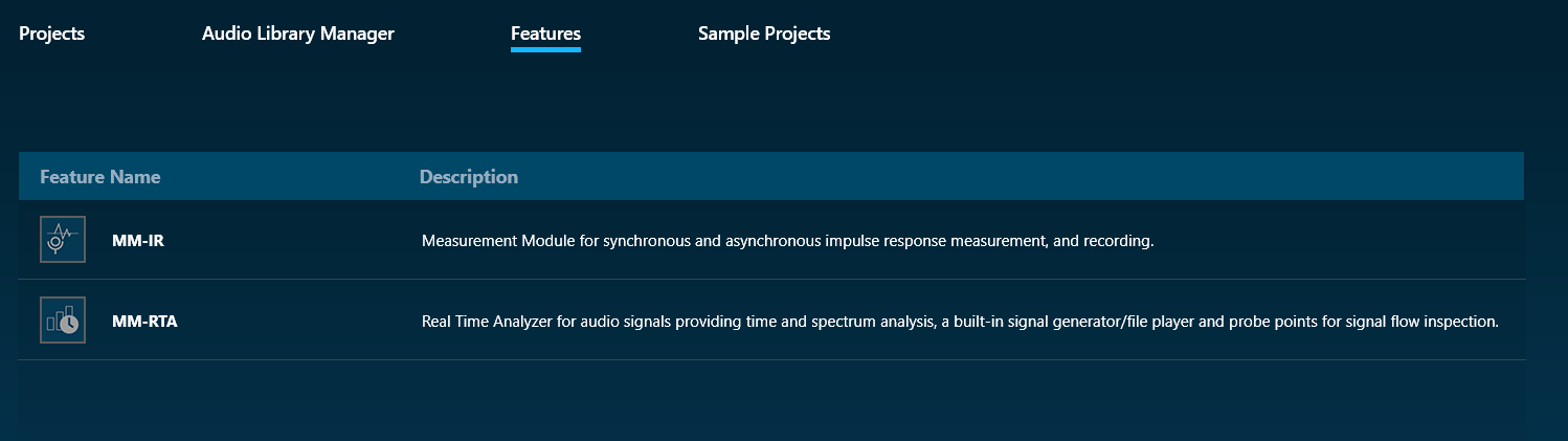 The Feature tab allows you to directly access the MM-IR (Measurement Module for synchronous and asynchronous impulse response measurement, and recording) and MM-RTA (Measurement Module for Real Time Analyzer) features without having to go through the entire process of creating a regular GTT project. The description of each feature is provided in the ‘Description’ column of the Features tab.