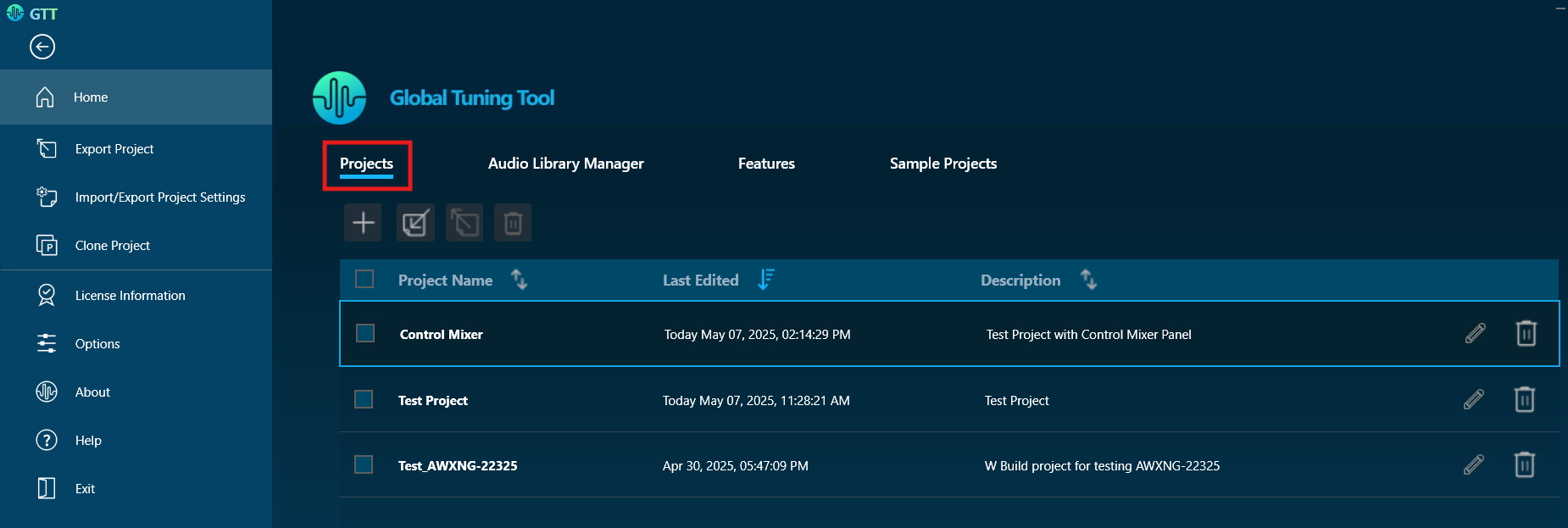 In the Project tab, you can create new projects, edit existing ones, and import a project, export selected project(s) or delete selected project(s).