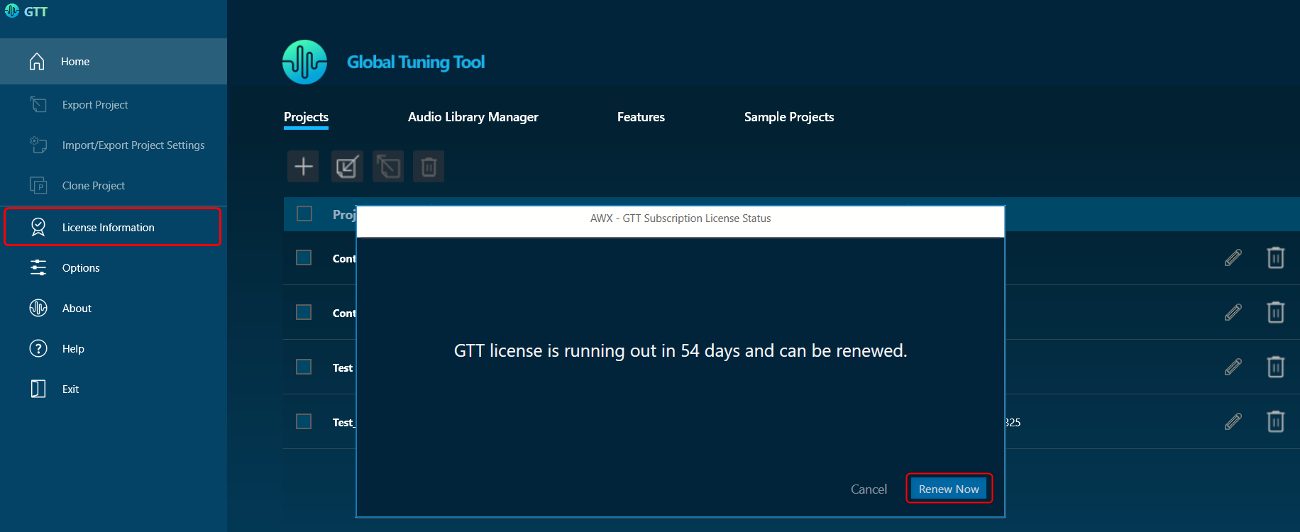 Click on License Information menu to see the AWX – GTT subscription license status. The license information window has a Renew Now button which enables you to extend the validity of your GTT license, and you may also request new features as part of the renewal process.